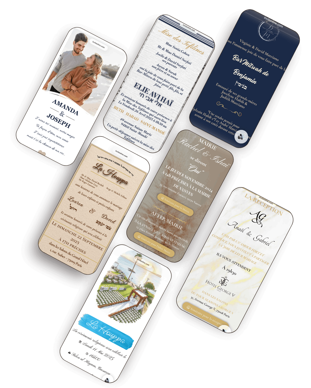 Qu’il s’agisse d’un mariage, d’une Bar/Bat-Mitsva, de fiançailles, d’une Brith Mila, d’une nomination ou d’une coupe de cheveux, nous réalisons des invitations digitales sur mesure qui subliment vos moments les plus précieux.